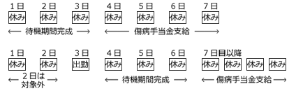 そこで、この傷病手当金の出番となります。傷病手当金は業務外の事由(仕事や通勤中以外)で病気や怪我のために労務不能となり、連続して休んだ4日目以降、休業時の生活保障として支給されるものです。注意点は、下記のように連続3日間休まないと待期期間が完成せず支給が開始されません。また、労災と違い、この待期期間の3日分について会社は賃金補償をする義務はありません。