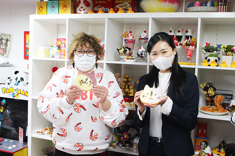取材時に、【ねこ型食パンの時計】の制作を体験させていただきました。食品サンプル用樹脂を混ぜて型に流しこんだり、色を付けたりしました。チョコペンで顔を書くのが難しかったですが、オリジナルの時計が完成しました。富岡様は、地域の方から愛される元気な方でした!(インタビュー担当A)