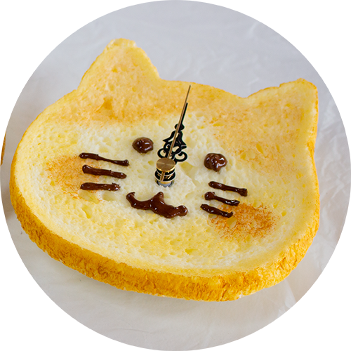 取材時に、【ねこ型食パンの時計】の制作を体験させていただきました。食品サンプル用樹脂を混ぜて型に流しこんだり、色を付けたりしました。チョコペンで顔を書くのが難しかったですが、オリジナルの時計が完成しました。富岡様は、地域の方から愛される元気な方でした!(インタビュー担当A)
