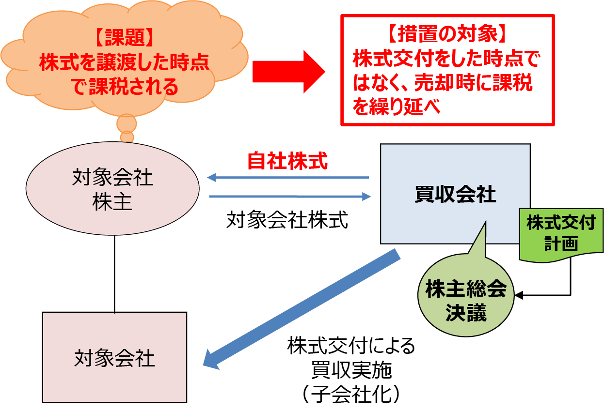 会社が、株式交付制度(会社が他の会社を子会社とするために、他の会社の株式を譲り受け、その対価として会社の株式を交付する制度)を用いてM&Aを行なった際に、買収する会社の株主の株式譲渡益の課税を売却時まで繰り延べる措置が創設されました。これによって、迅速なM&Aの促進、新たな産業・企業の育成が見込まれます。