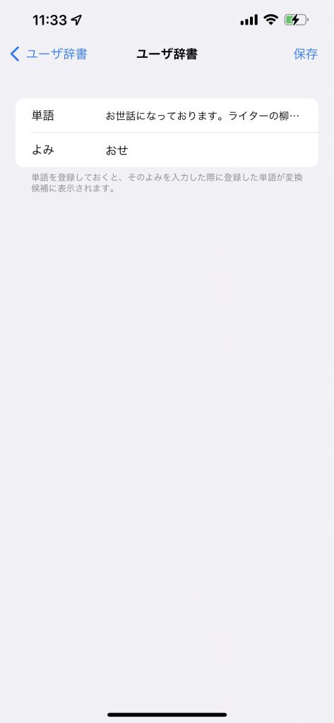 「設定」の「一般」から「キーボード」を開き、「ユーザー辞書」の「+」をタップして単語と読みを入力します。例えば、上記の文章なら「おせ」と入力して変換できるようにしておくとよいでしょう。