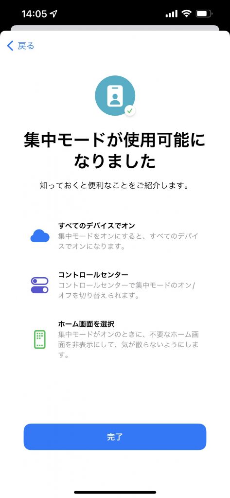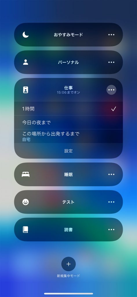 設定が完了したら、コントロールセンターから「集中モード」をタップし、「仕事」を選択すれば有効になります。もう一度タップすれば無効になります。「・・・」メニューから「1時間」とか「今日の夜まで」「この場所から出発するまで」といった無効にするタイミングを指定することも可能です。