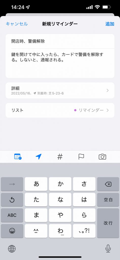 連休明けに出社する際、誰もいないので警備を解除しなければいけない、という時にも「リマインダー」が活躍します。到着時にすぐ対応しなければ、警備会社に通報が行ってしまいます。普段は他の人が開けていて、忘れてしまいそうならリマインドしましょう。とは言え、アラームをかけようにも、何時に到着するかはわかりません。そんな時、位置情報を利用し、会社に到着した時に「カードで警備解除!」のようなリマインダー通知が届くようにしておくと安心です。