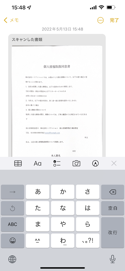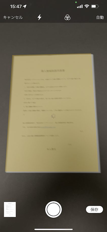 書類全体をできるだけ真上から撮影します。黄色い枠が書類に綺麗に重なるようにしましょう。ゆがみ補正や色の補正などを行い、スキャンしたような画像がメモアプリに貼り付けられます。
