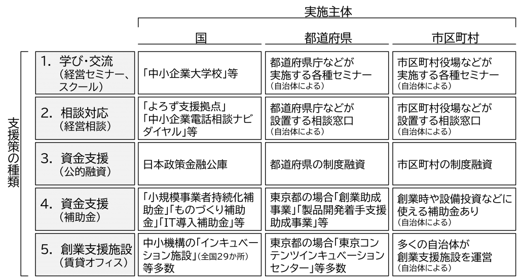 下図の通り、先に挙げた5種類の支援策を、3つの実施主体(国・都道府県・市区町村)が、それぞれ展開しています。これが、支援策の全容です。
