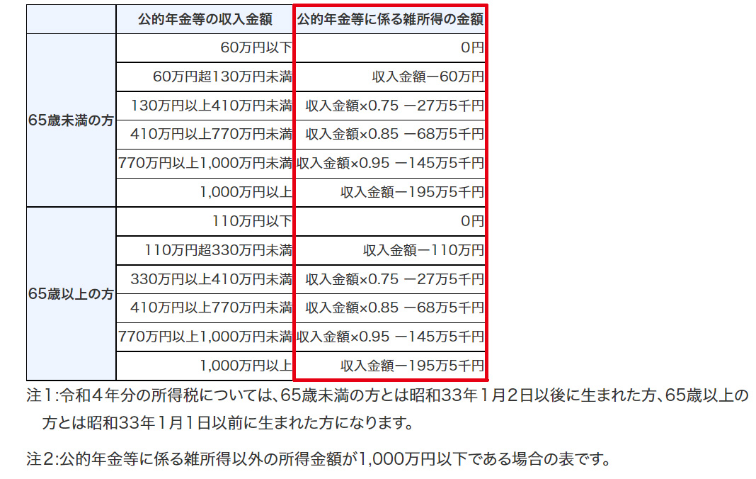 なお、注意書きにもある通り、こちらは「公的年金等以外の所得合計が1000万円以下」限定の表です。年金以外の所得額が1000万円を超えるなら、次のリンクで公的年金等の所得額をご確認ください。