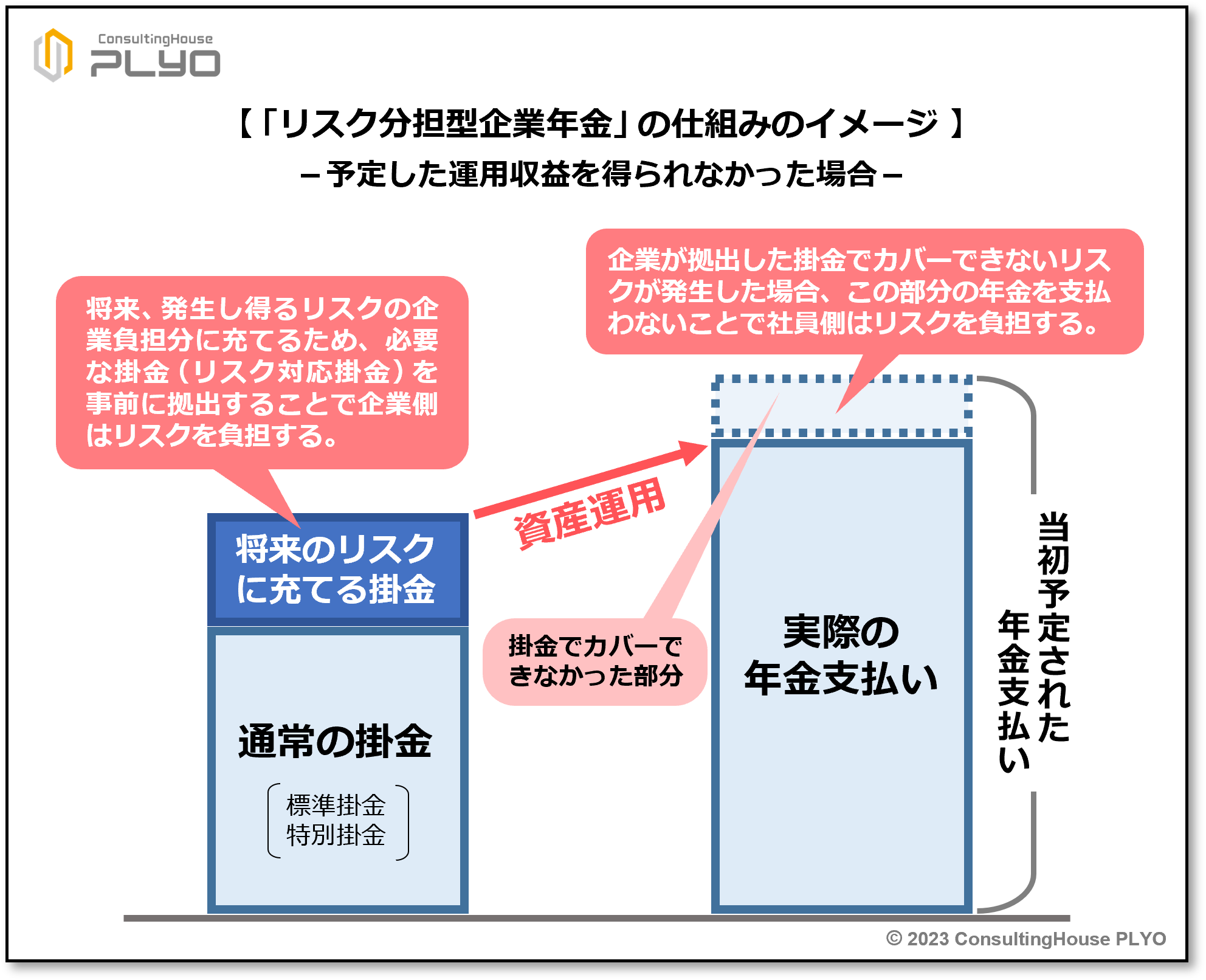 一方、社員側は、企業が拠出した掛金ではカバーしきれないリスクが発生した場合に、年金額をマイナス調整することで社員負担分のリスクを負う、という仕組みである。