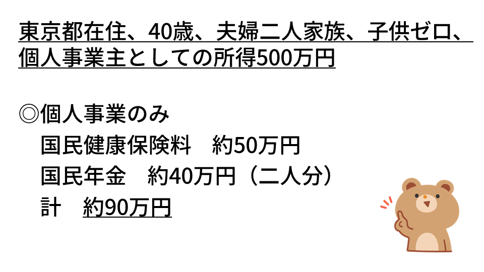 ※前提として、東京都在住、40歳、夫婦二人家族、子供ゼロ、個人事業主としての所得500万円とします。