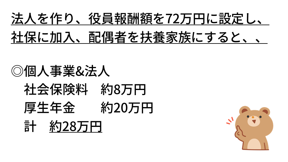 (役員報酬額を年72万円に設定し、社保に加入、配偶者を扶養家族にすることを想定)