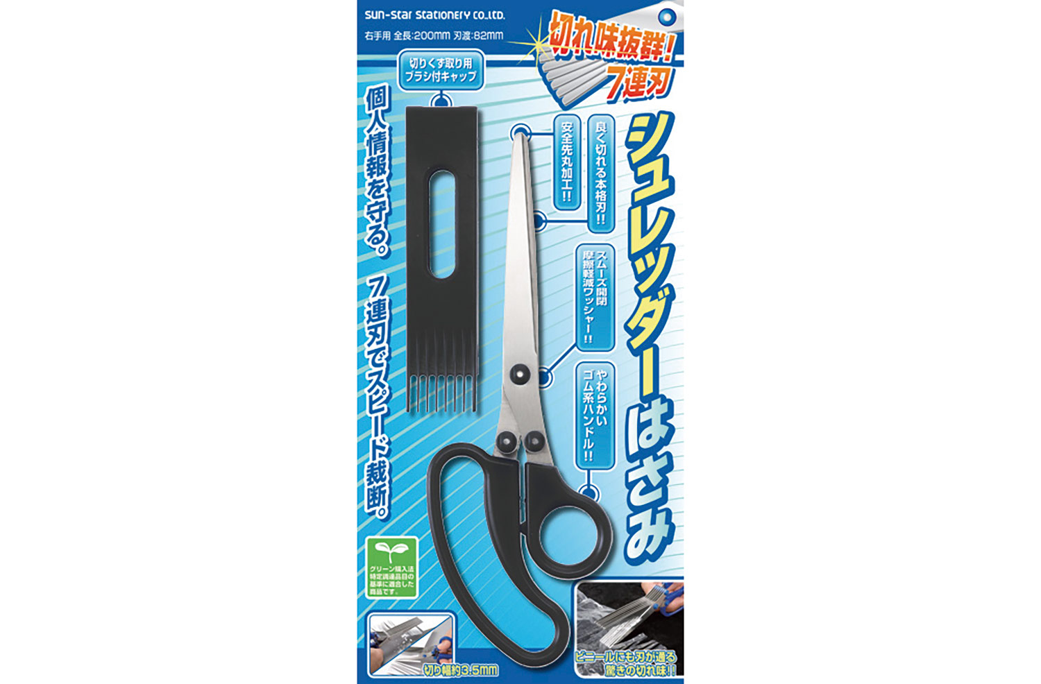 サンスター文具の「7連刃シュレッダーはさみ」は、はがきや封筒などザクザク切れる個人情報を保護するはさみです。よく切れる7連刃のはさみなので広範囲を一度に素早く裁断できます。特にはさみの場合は切りたいものをピンポイントで切れるのが特徴です。ハガキやカード、宛名ラベルをなど小さいサイズのものでも小回りがききます。