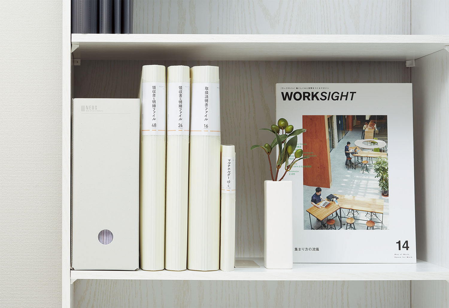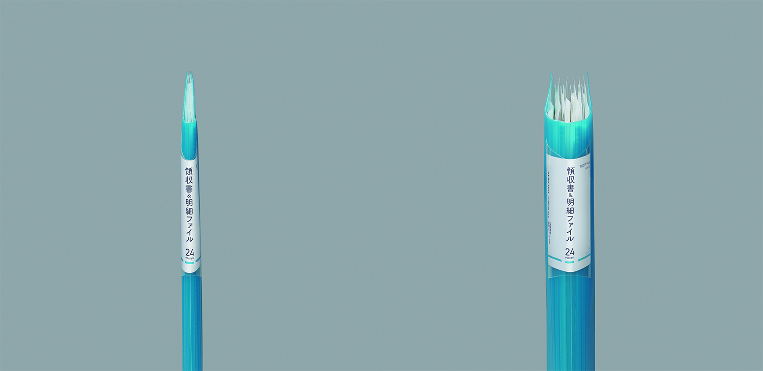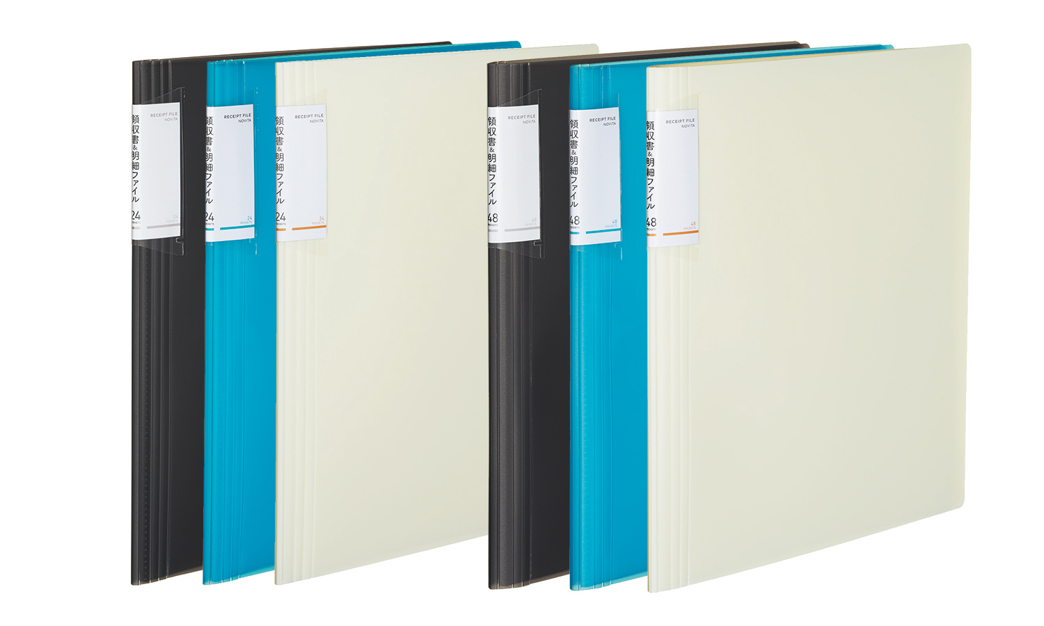 ノビータの最大の特徴は、背幅が変わることです。ファイルの多くは背幅が決まっているため、収納数が少なくても幅をとられてしまいますが、ノビータは書類が少ない時は薄く省スペースに保管できます。写真左側は書類が入っていない状態で、右側は書類が入った状態です。書類量が多い時は背幅とポケットが広がり、たっぷり収容できます。大量に書類を入れてもファイルした書類が丸まらず、表紙がピッタリきれいに閉じます。デスクに積み重ねて置いても、崩れないので会計や雑務の作業にぴったりです。「領収書&明細ファイル ノビータ」はページ数が24Pと48Pの2タイプあるので、収納したい量に合わせて選ぶのがおすすめです。