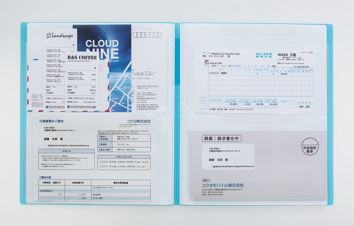コクヨの「領収書&明細ファイル ノビータ」は、片側に2ポケットずつ見開きで4ポケットついています。それぞれのポケットには、脱落防止のフラップとしっかり入るマチがついているので複数枚の書類がしっかり入ります。書類はA5サイズ、封筒は長形3号まで入ります。購入すると便利な分類ラベルもついているので、月毎や用途ごとにてサクサク分類できます。