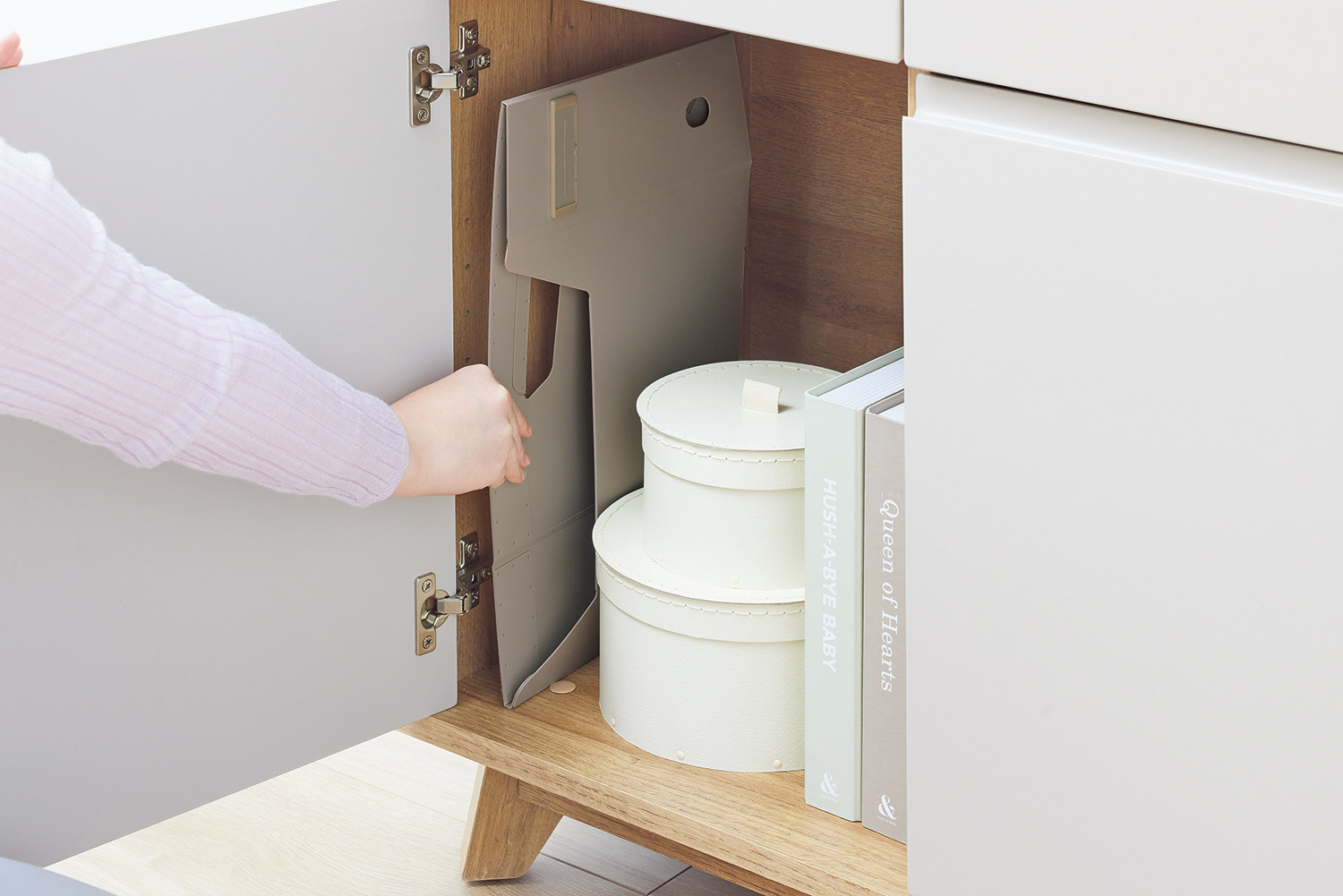 また、ボックスファイルは使わないときは折りたたむと写真のようにスリムになるので、省スペースでサッと収納できます。ボックスファイルは、書類だけでなく日用品やキッチン用品などを収納することもできるので、書類の収納が不要になったら別の場所でも使えます。柔軟的な使い方ができる最新の収納です。