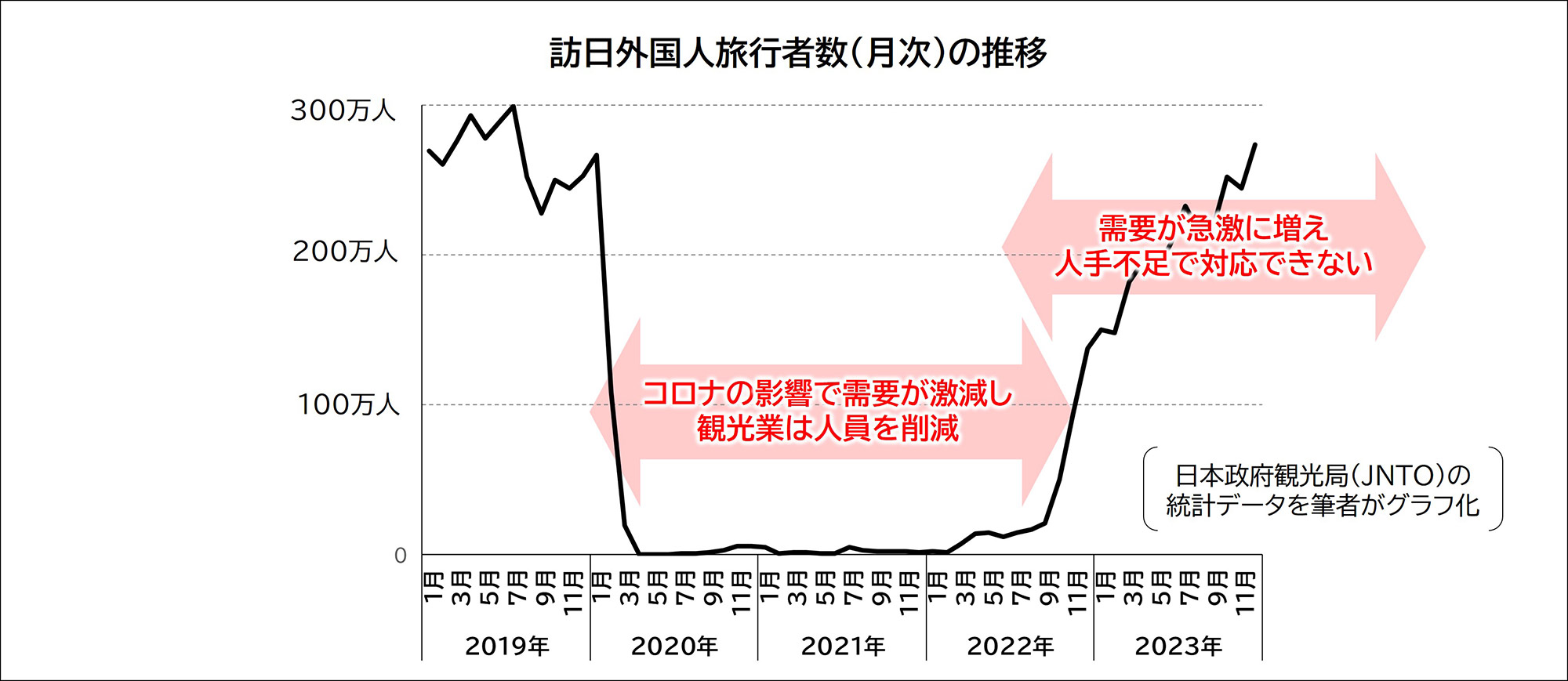 日本人の動きも大きく変動しましたが、インバウンドは特に激しく変動しました。コロナ前、政府は東京2020オリンピック・パラリンピックに向けた政策を展開していて訪日外国人旅行者数がうなぎのぼりに増えていました。そこにコロナ禍が始まったのです。2020年3月にはインバウンドは急転直下でほぼゼロになり、その状態が3年近く続いた後に回復に向かい、2023年末にはコロナ前の水準を超えています。