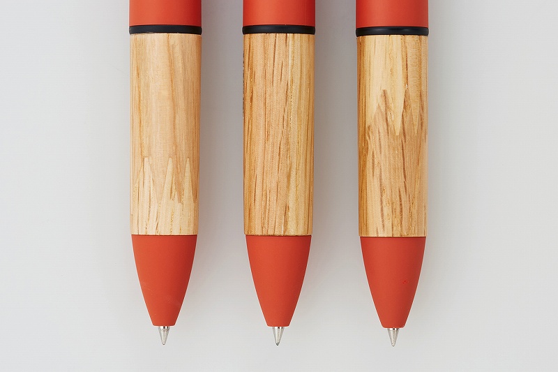 カリモク家具の木製家具の製造工程で生まれる木の端材をグリップに再生利用されています。サンセットオレンジにはナラ材、スチールブルーにはウォールナット材をグリップとして採用されています。木目や色合いに天然木ならではの違いがあり、木軸部は木目や色合いが1本1本異なるので毎日使っていくのが楽しみになります。