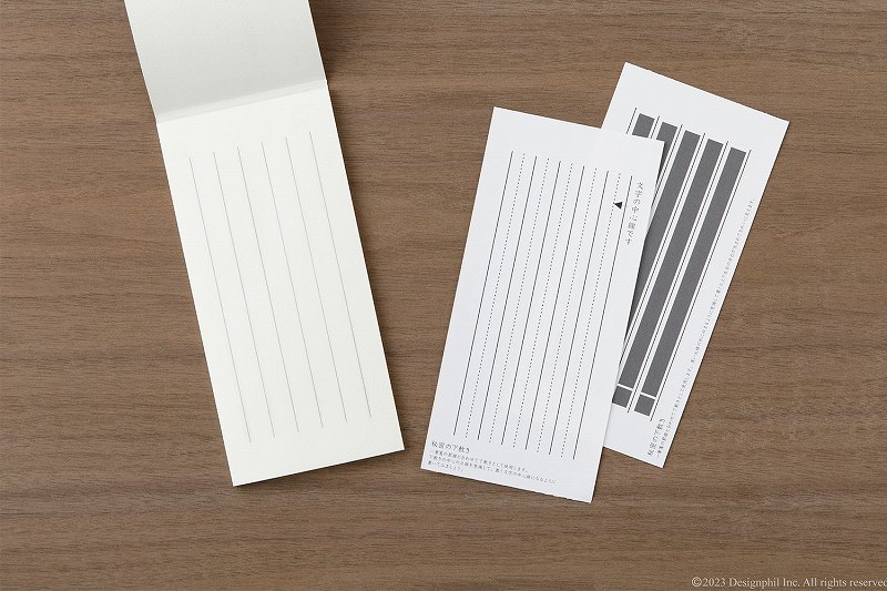 一筆箋は、縦横両用と縦罫の2種類あります。値段は、縦横両用は418円(税込み)で、縦罫は396円 (税込)です。それぞれ30枚入で、付録に文字のお手本と秘密の下敷きが入っています。秘密の下敷きは一筆箋の下に敷いてもガイドラインがちゃんと見えるので、ガイドラインを意識しながら文字を書くと、きれいに揃った文字を書くことができます。行数は5行なので、一言メッセージを添えたいときにおすすめです。