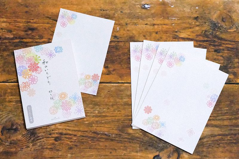 こちらは「和のいろどり」という絵柄の、ひとことふたこと箋です。和のテイストの絵柄で、たてよこ両用で使えます。「和のいろどり」は罫線がなく2柄24枚入っています。ひとことふたこと箋は絵柄によって縦罫や横罫、エンボスやラメ加工などの加工法も変わります。同じ絵柄の「ひとことふたこと封筒」もあります。郵送不可のミニサイズで、ポチ袋としても使えます。