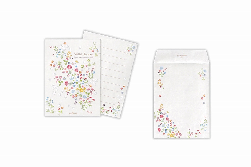 プチギフトと添えるときにおすすめの絵柄は「ワイルドフラワーIII」です。可憐な小花をモチーフにしたデザインでホールマークのロングセラー商品です。小花が細かいエンボス加工されているので高級感ある仕上がりです。こちらは1柄12枚入りで、横罫入り。値段はワイルドフラワーIIIのひとことふたこと箋は308円(税込み)ひとことふたこと封筒は4枚入りで308円(税込み)です。