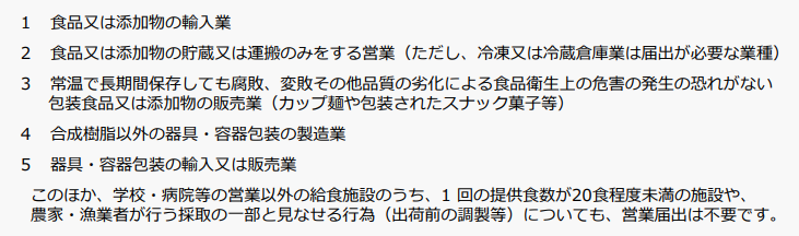 こういった業種は食品に手を加えずに販売できます。また、保管方法に関係なく衛生環境を保つことが可能です。こういった理由から許可も届出もなく販売可能となっています。