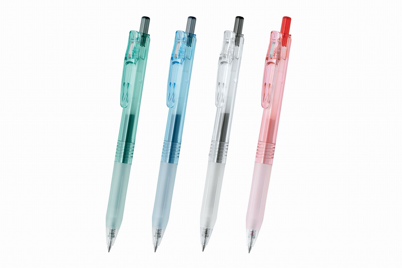 「バイオチューブ搭載サラサクリップ」のボール径は0.5mm。軸色は、写真左からオーシャンブルーグリーン、アースブルー、ウォータークリアーの3色はインク色が黒、一番右のサンライズコーラルはインク色が赤です。値段は132円(税込み)です。従来のサラサクリップと同じ書き心地で環境にも配慮したペンです。