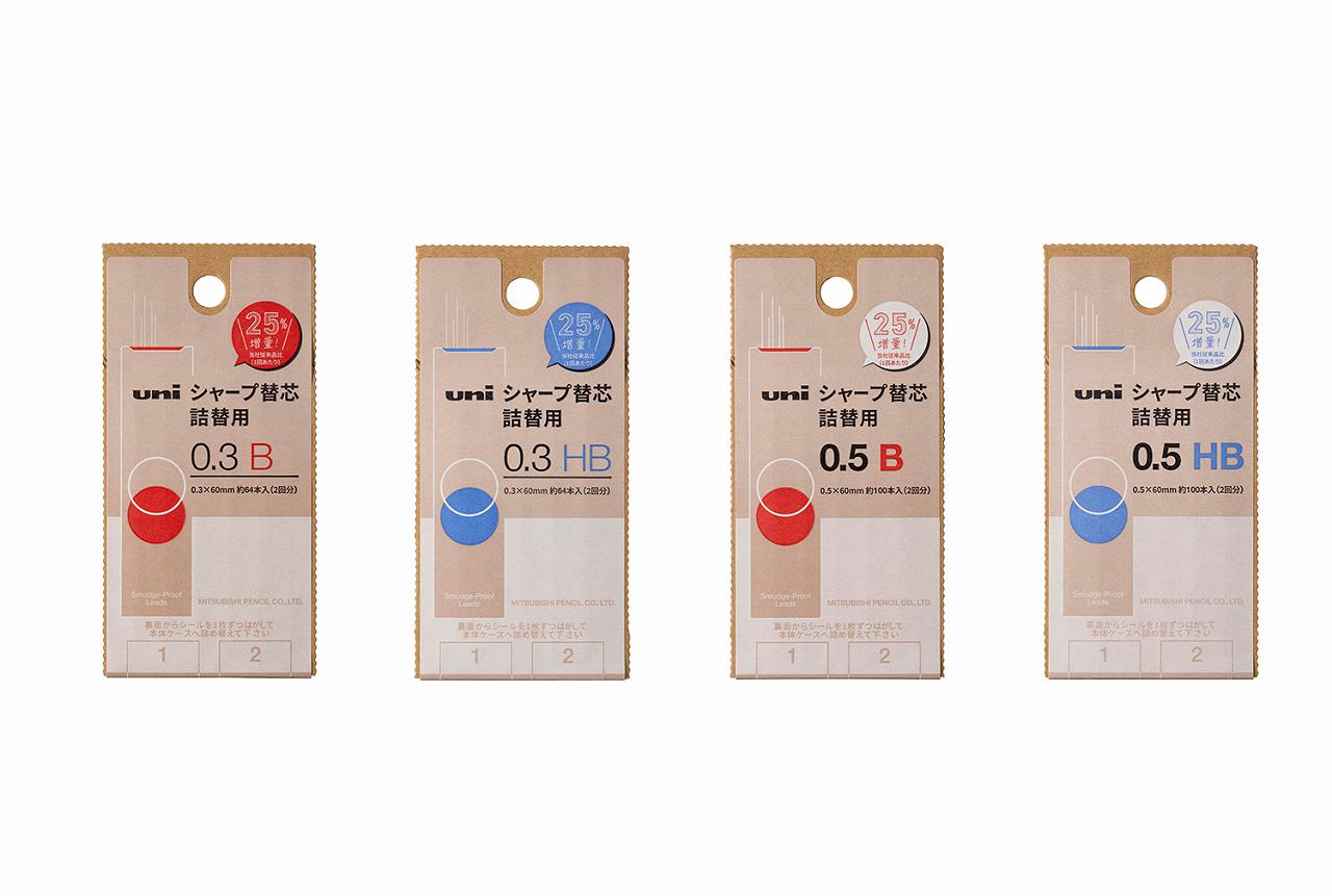 芯径は0.3mmと0.5mm、硬度はHBとBの4種類