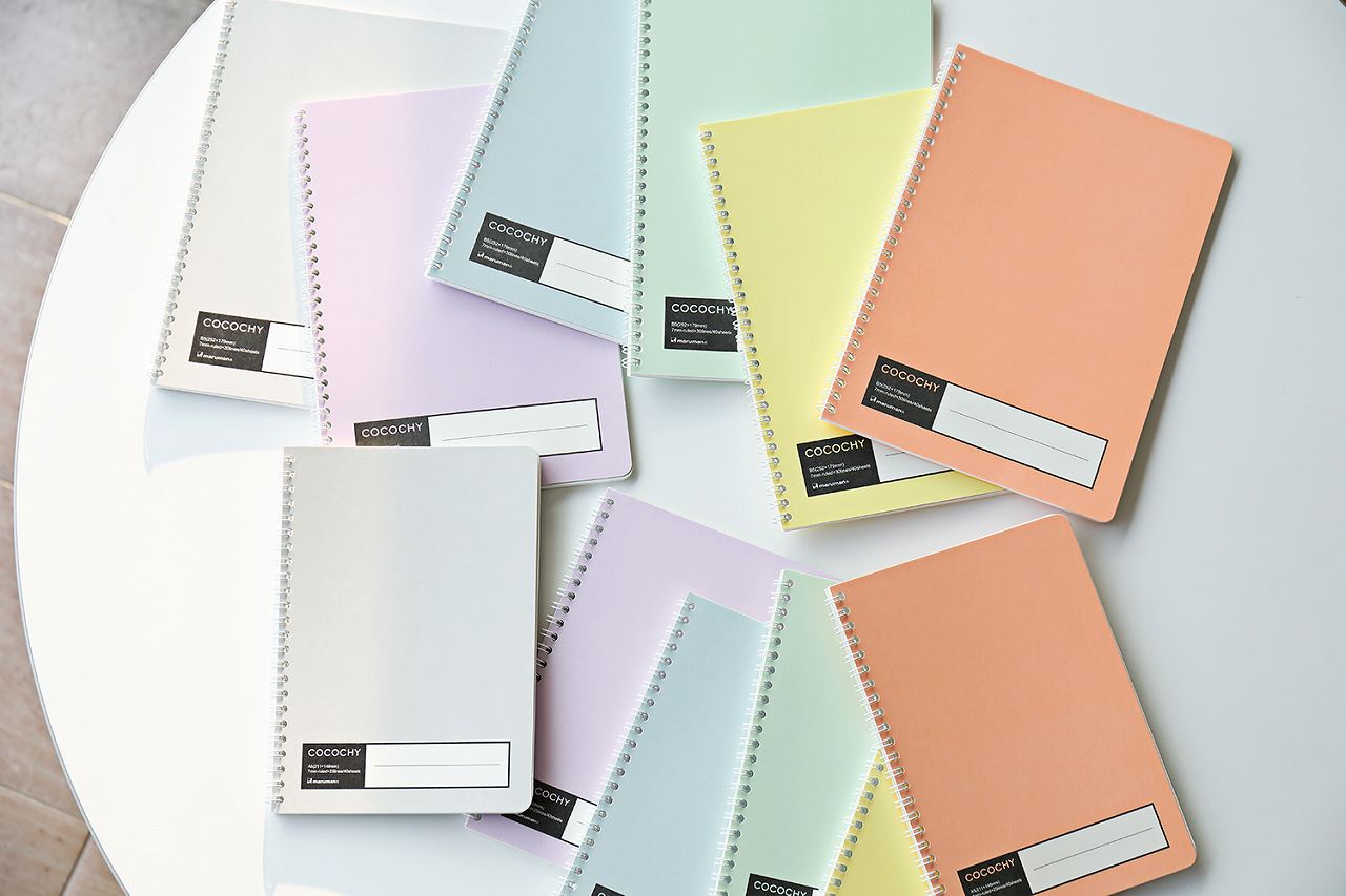 マルマンの「COCOCHY(ココチィ)」は、使う人と環境にやさしいサステナブルなリングノートです。表紙・扉・本文のすべての紙が「FSC®認証紙」が使われています。そして表紙は、プラスチック代替素材として開発された「FSエリプラ+」が採用されているので、水や油に強く多少の汚れならサッとふき取ることができます。本文にはなめらかな書き心地のマルマンオリジナル筆記用紙が使われています。ウラ抜けしにくく、なめらかな書き心地なので普段使いにぴったりなノートです。