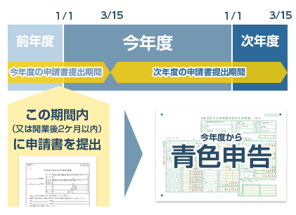 事前に税務署に『青色申告承認申請書』を提出する必要があります。新規に開業した場合も、何もせずにいれば白色となります。青色申告を希望する場合には、開業届と同時に所轄の税務署長宛てに『青色申告承認申請書』を提出します。事業を開始している場合は、青色申告に変更する年の3月15日までに申請書の提出してください。