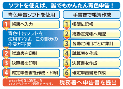 手書きの帳簿と違い、転記や集計する必要がなくなります。計算が必要な個所は自動計算。書き損じの心配もありません。さらに、青色申告65 万円控除を受けるには複式簿記による記帳が必須です。この点も会計ソフトを利用するとラクに記帳を行うことができます。