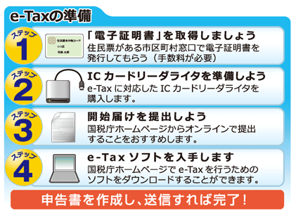 e-taxは青色申告ソフトで作成したデータをそのままネットで送信できます。忙しい中税務署に行かなくても、国税庁ホームページの『国税庁 確定申告書等作成コーナー』で申告書を作成し、自宅からネットで提出(送信)できます。そして24時間受付も便利ですね。日中は仕事が忙しく深夜にしか作業できない方にもピッタリです。