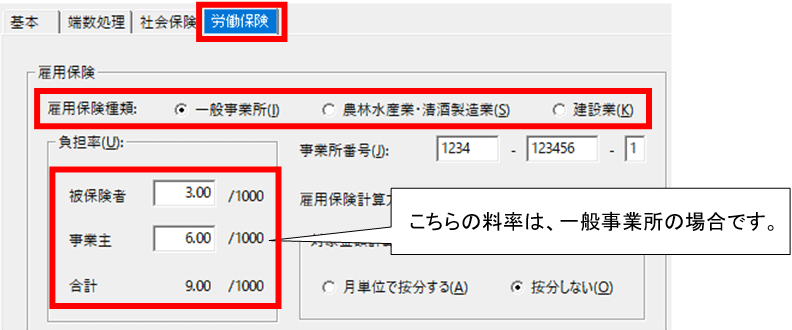 雇用保険料率は、[設定] ― [給与規定] ― [労働保険] タブにてご確認いただけます。