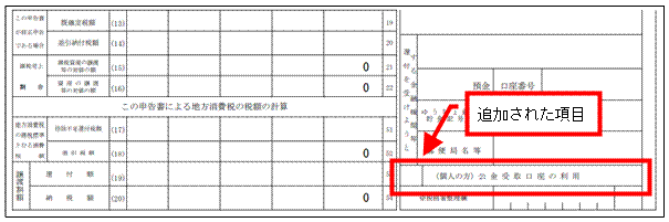 ・個人事業者用 消費税申告書 第1表の右下の「還付を受けようとする金融機関等」欄に「(個人の方)公金受取口座の利用」欄が追加されました。
