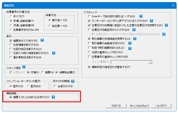 対応「帳簿」メニューの「機能設定」画面に、補助機能「□摘要入力による絞り込みを行う」が追加されました。
