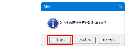 入力内容を確認し、「VM1データ取込(振替伝票)」画面右上[終了]ボタンをクリックしますと下のメッセージが表示されますので、[はい]をクリックします。