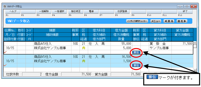 「VM1データ取込」画面に戻ります。振伝マークが付いていることをご確認ください。
