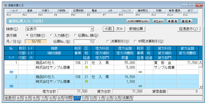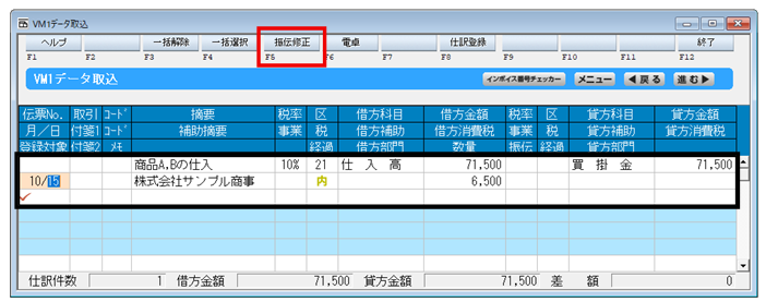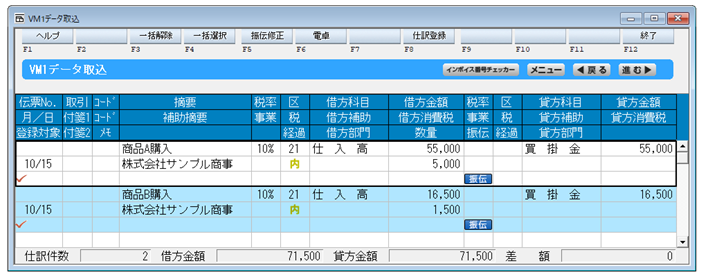 取引金額に消費税率「10%」と「軽減税率8%」が混在している証憑や、あらかじめ「VM1」の「システム」-「利用設定」にて、「証憑の1明細に対して1行の仕訳を生成する」がONに設定されている場合は、「MA1」の「帳簿」-「VM1データ取込」を起動したタイミングで、自動的に振替伝票形式の仕訳候補が表示されます。