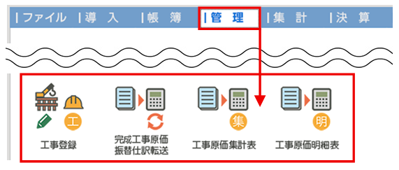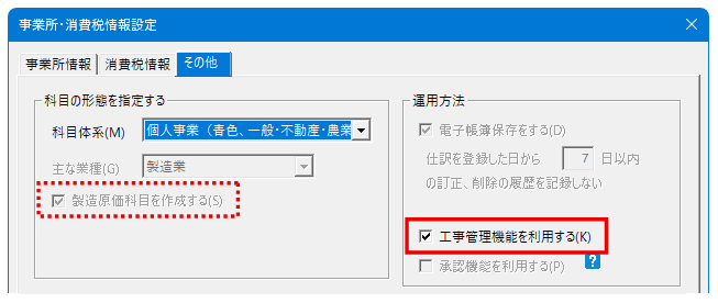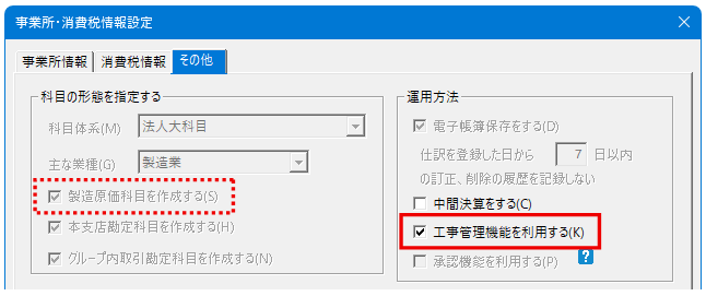 「事業所・消費税情報設定」-「その他」にて「製造原価科目を作成する」にチェックが付いているデータにて「□工事管理機能を利用する」にチェックを付けて設定することで、「管理」メニューより「工事管理」機能をご利用いただけます。
