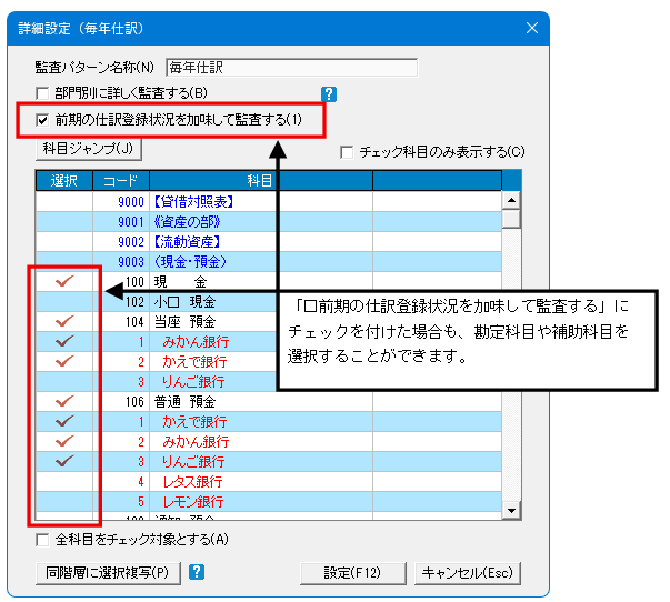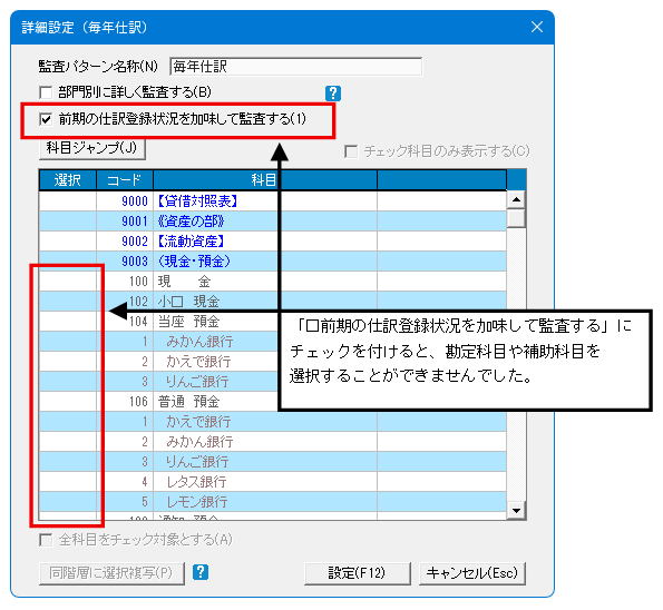 本プログラムを適用することで、監査項目「毎年仕訳」および「新規使用科目」において、詳細設定で「□前期の仕訳登録状況を加味して監査する」にチェックを付けた場合でも、勘定科目を選択することができます。