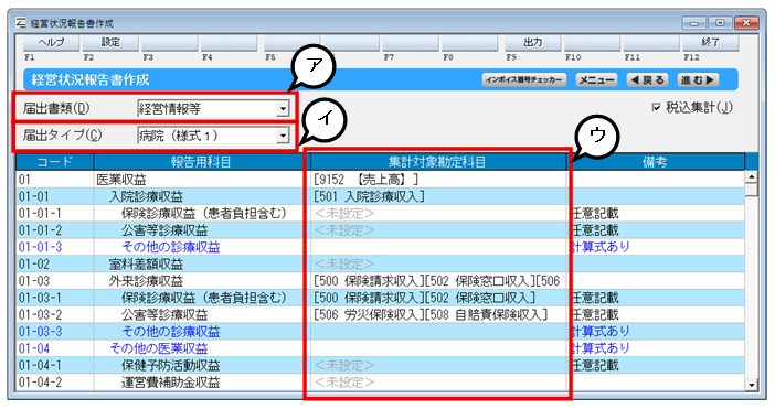 「決算」-「経営状況報告書作成」より、出力する「届出書類(図:ア)」「届出タイプ(図:イ)に切り替え、必要に応じて「報告用科目」に「集計対象勘定科目(MA1の勘定科目、図:ウ)」を対応付けします。