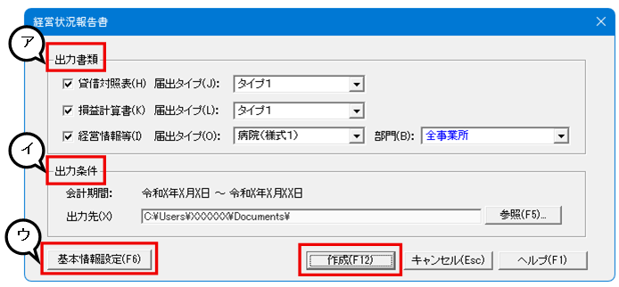 | (ア)出力書類 | 出力する「貸借対照表」「損益計算書」「経営情報等」にチェックを付け、