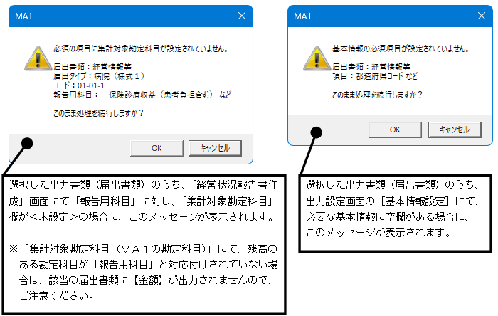 ※「集計対象勘定科目(MA1の勘定科目)」にて、残高のある勘定科目が「報告用科目」と対応付けされていない場合は、該当の届出書類に【金額】が出力されませんので、ご注意ください。