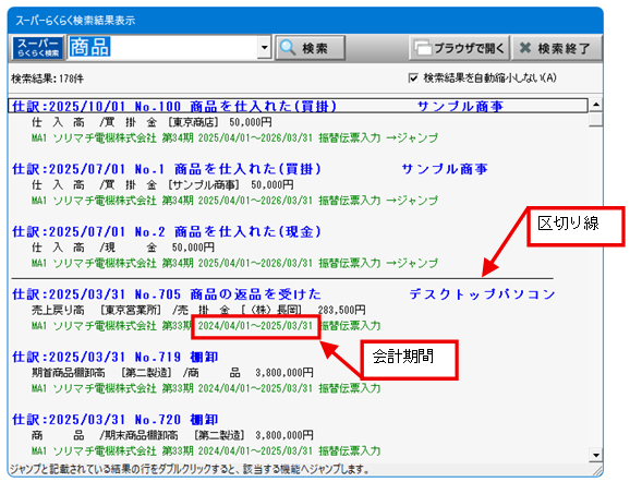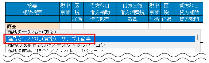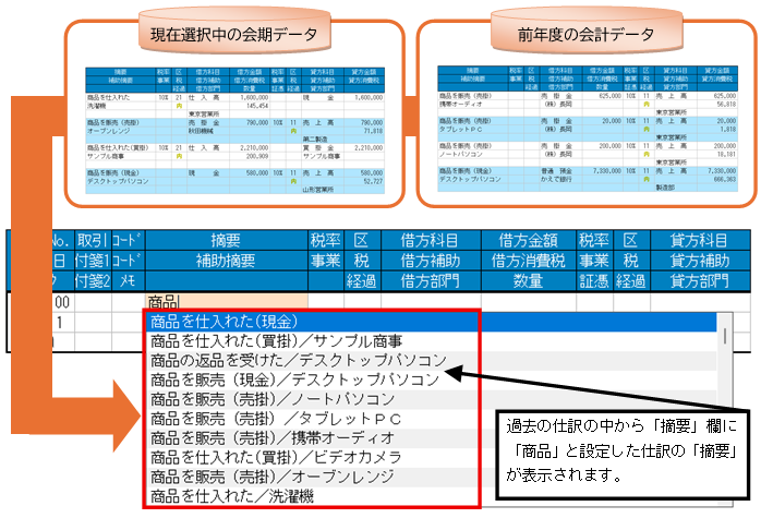 「現在選択中の会計データ」と「その前年度の会計データ」より、入力した文字列(例の場合「商品」)と一致する仕訳候補を照会し、ドロップダウンリストに表示されます。