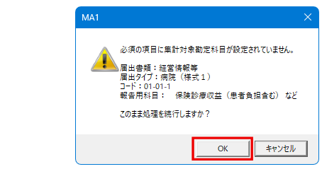 ※「報告用科目」に対応する勘定科目がMA1にない場合(「集計対象勘定科目」が<未設定>の場合)、下の確認メッセージが表示されますが、[OK]ボタンでお進みいただけます。