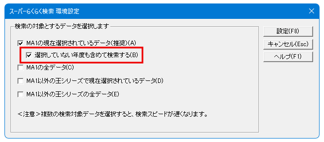 「スーパーらくらく検索 環境設定」画面に、「□選択していない年度も含めて検索する」を追加しました。