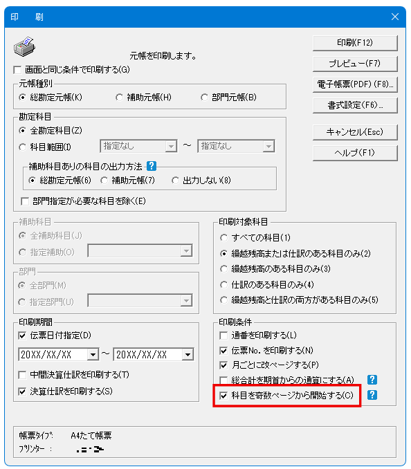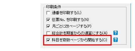 「帳簿」-「元帳」の印刷条件にチェック項目「□科目を奇数ページから開始する」を追加しました。