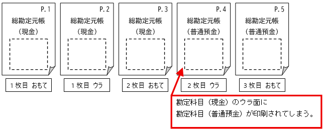 両面印刷を行うと総勘定元帳(現金)の3ページ目のウラ面に、総勘定元帳(普通預金)の1ページ目が印刷されます。