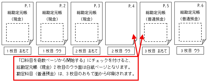 プリンターの両面印刷機能を利用して「元帳」を印刷する際に、「□科目を奇数ページから開始する」にチェックをつけることで、勘定科目ごとに用紙を分けて印刷することができるようになります。