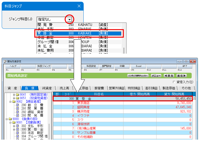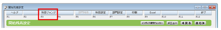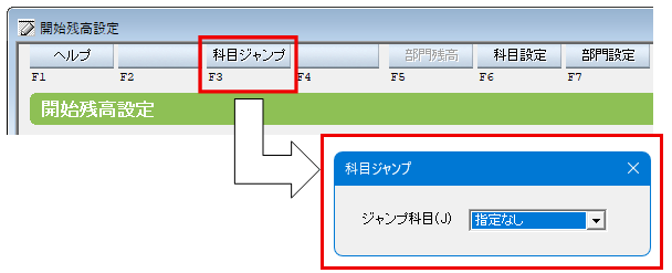「導入」-「開始残高設定」の画面左上[科目ジャンプ]をクリックすると科目ジャンプダイアログが表示されます。