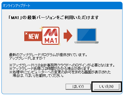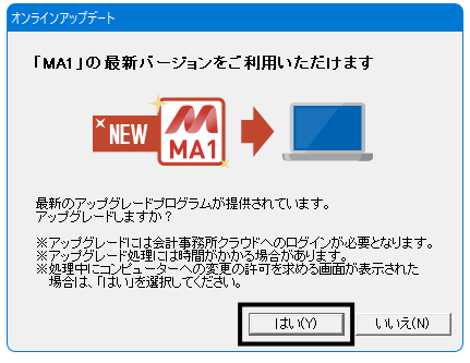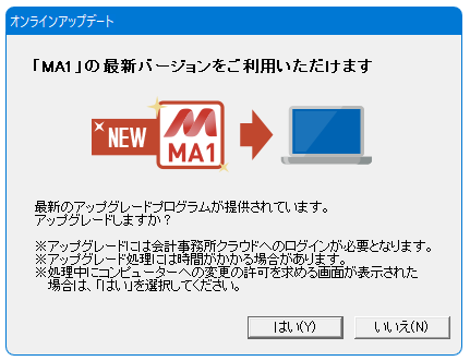 最新バージョンの提供後、「MA1」の起動時に下の画面が表示される場合は、下記手順にて最新バージョンをご利用のパソコンにインストールしていただくことで上記機能アップ内容をご利用いただけます。