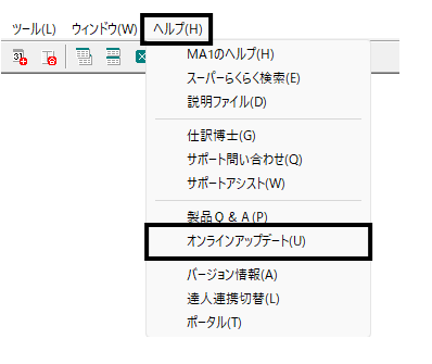 4.メニューバーの「ヘルプ(H)」→「オンラインアップデート(U)」をクリックします。