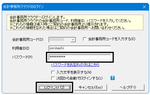 7.下の画面が表示された場合、会計事務所クラウド上のデータを取得する場合は、「パスワード」欄に古いバージョンで使用していた「パスワード」を入力し、[ログイン]をクリックします。